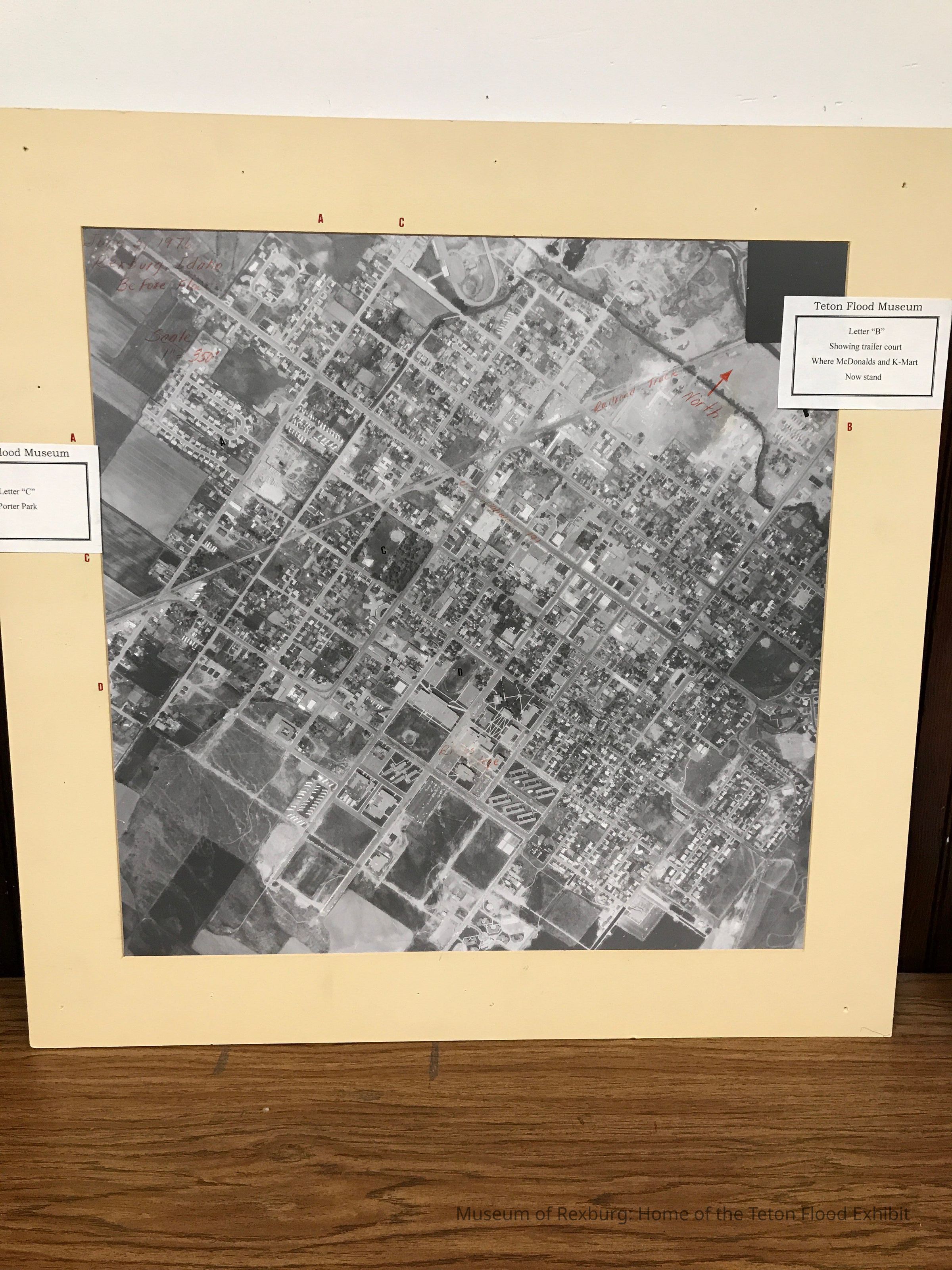 This photo is 28.25x28 and is a black and white aerial shot of Rexburg. It has red writing on the photo saying where things are and on the mat there are letters to be able to find different locations. On the front it says, June 5, 1976 Rexburg, Idaho, Before Flood. Scale 1"= 350'.