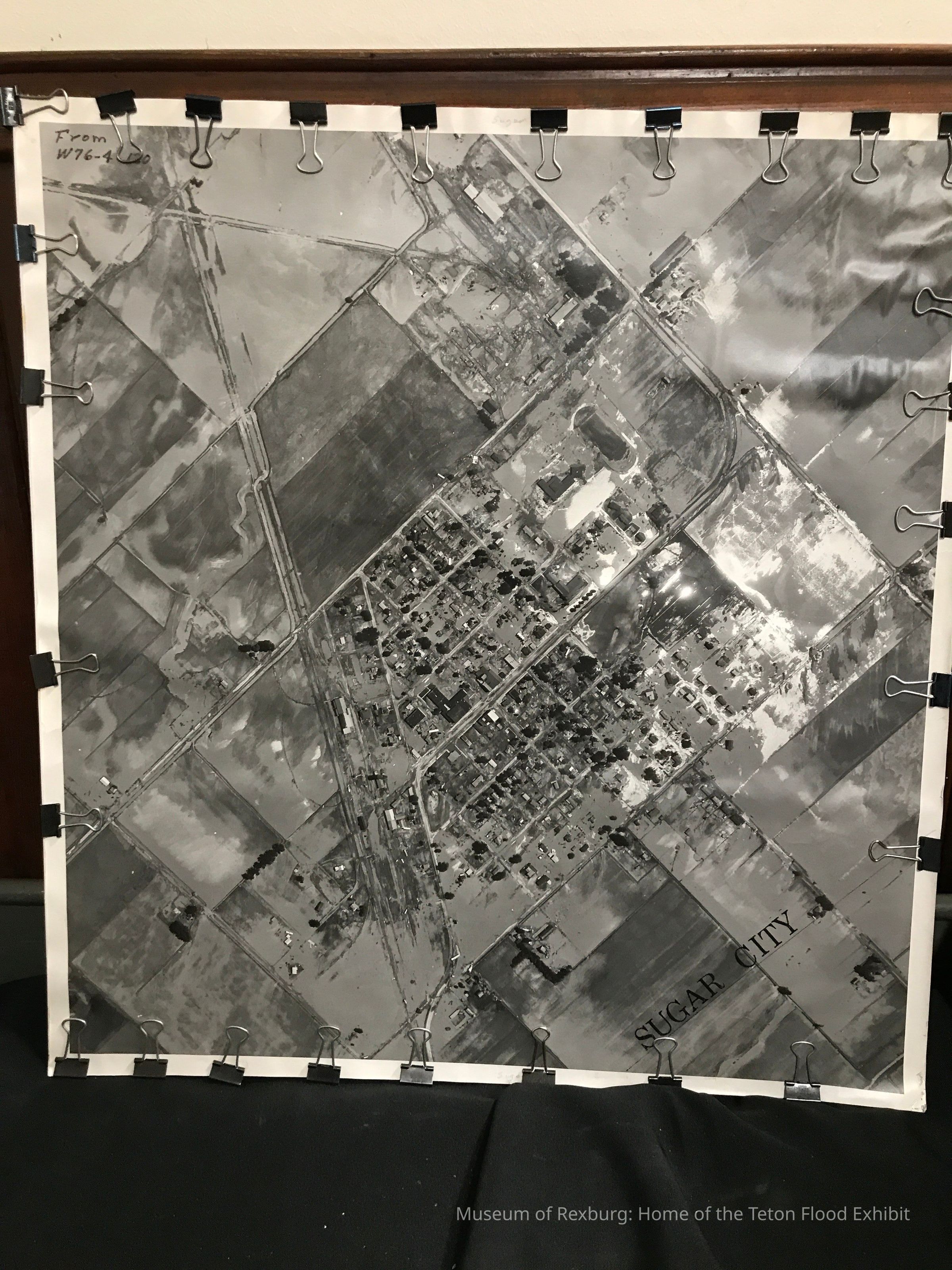 This photo is 28.25x28 inches and is a black and white aerial shot of the flood waters in Sugar City. It has the words Sugar City written in black near the right hand bottom corner. The words Sugar City are also written in pencil on the bottom center. The words From W76-4-120 are written in the top left corner. The photo is 20 x 22 inches. There are black clips along all the edges of the photo.