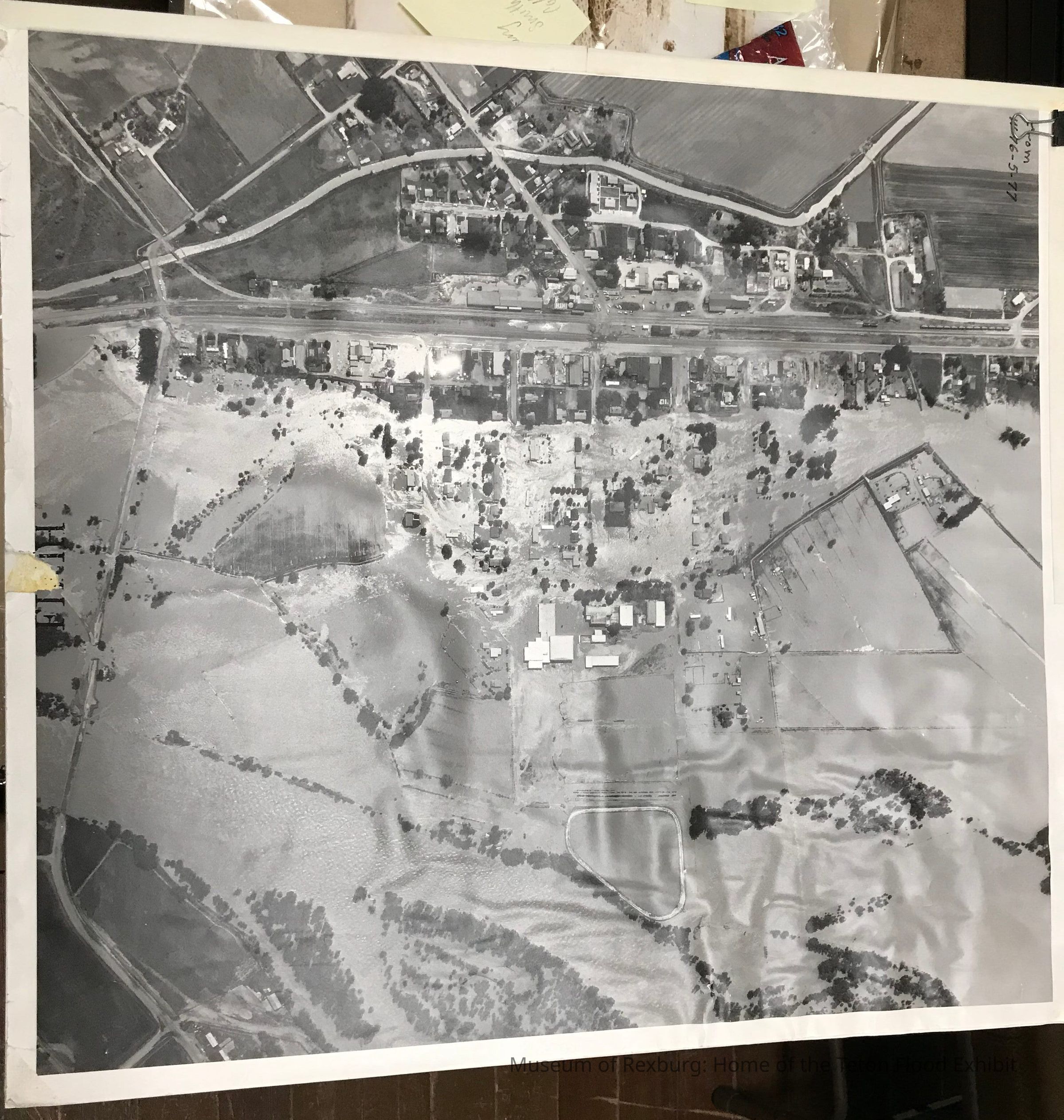 This photo is 28.25x28 inches and is a black and white aerial shot of the flood waters in Firth. It has the words Firth written in the top center. The words From W76-5-77 are written in the bottom right corner. The photo is 20 x 22 inches. There is one black clip on the right hand corner and plastic framing around the right hand edges.