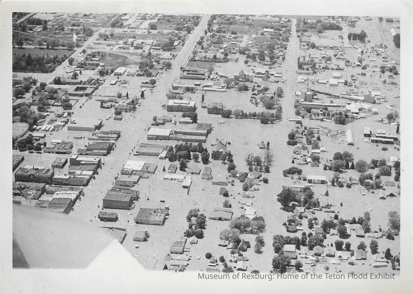 On the back of a copy of this photo that was not kept because it was in poorer condition it has written, "The Water Got Deeper Teton Dam Disaster 155% #7 -- This overall view of Rexburg was taken about 30 minutes after the water reached the city. It had not yet covered the portion of the city in the upper portion of the city, but it did shortly after this picture was taken. Aed and pay! Rexburg Standard Journal 115% B-1 Rexburg".