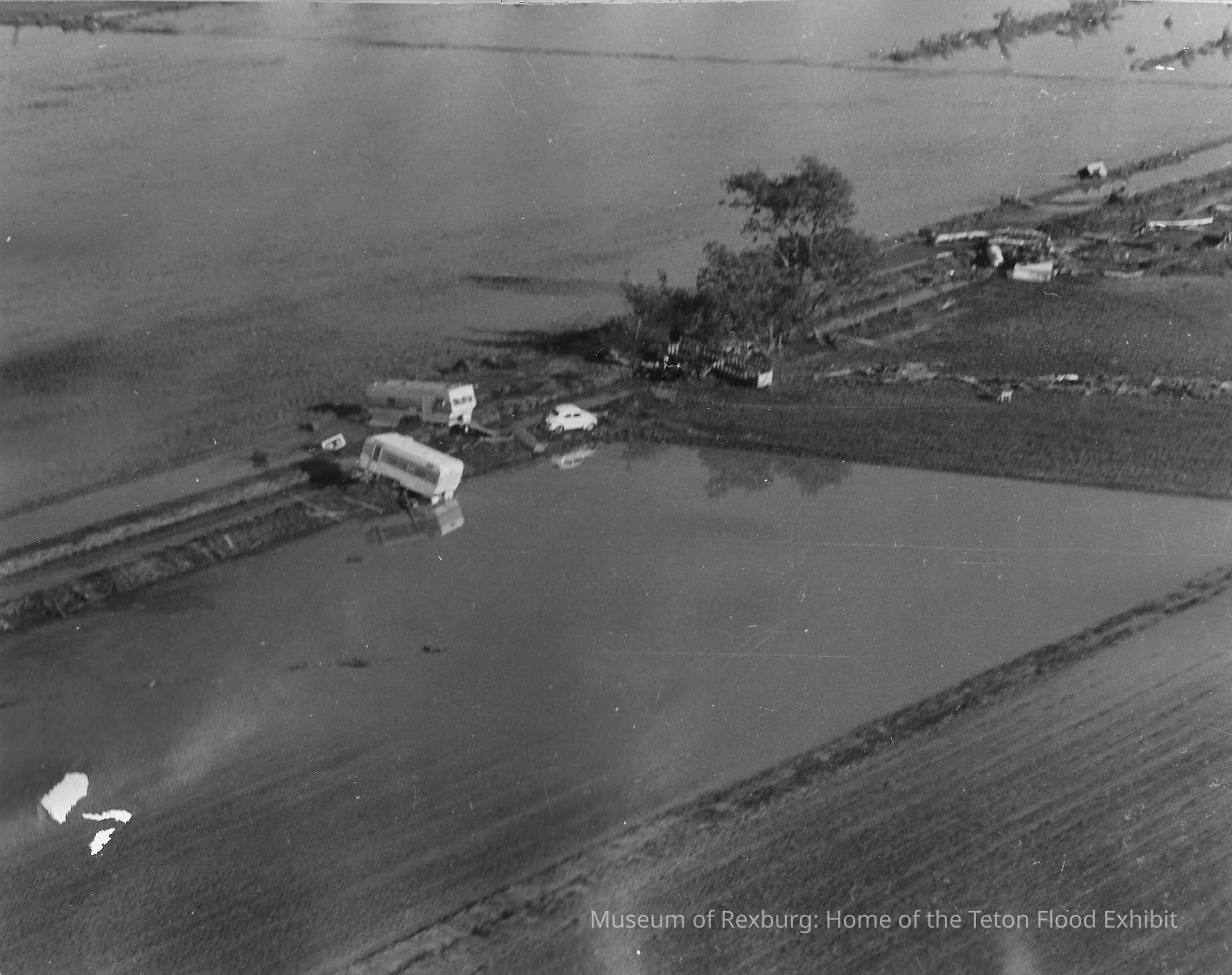 This photo is black and white and shows two campers lodged in their spots by the flood There are also many other vehicles that have been dropped off and left behind by the flood. This photo is 8 x 10 inches big. Same as 2021-20-256. This photo comes from the old Standard Journal Warehouse located at 23 S 1st E.