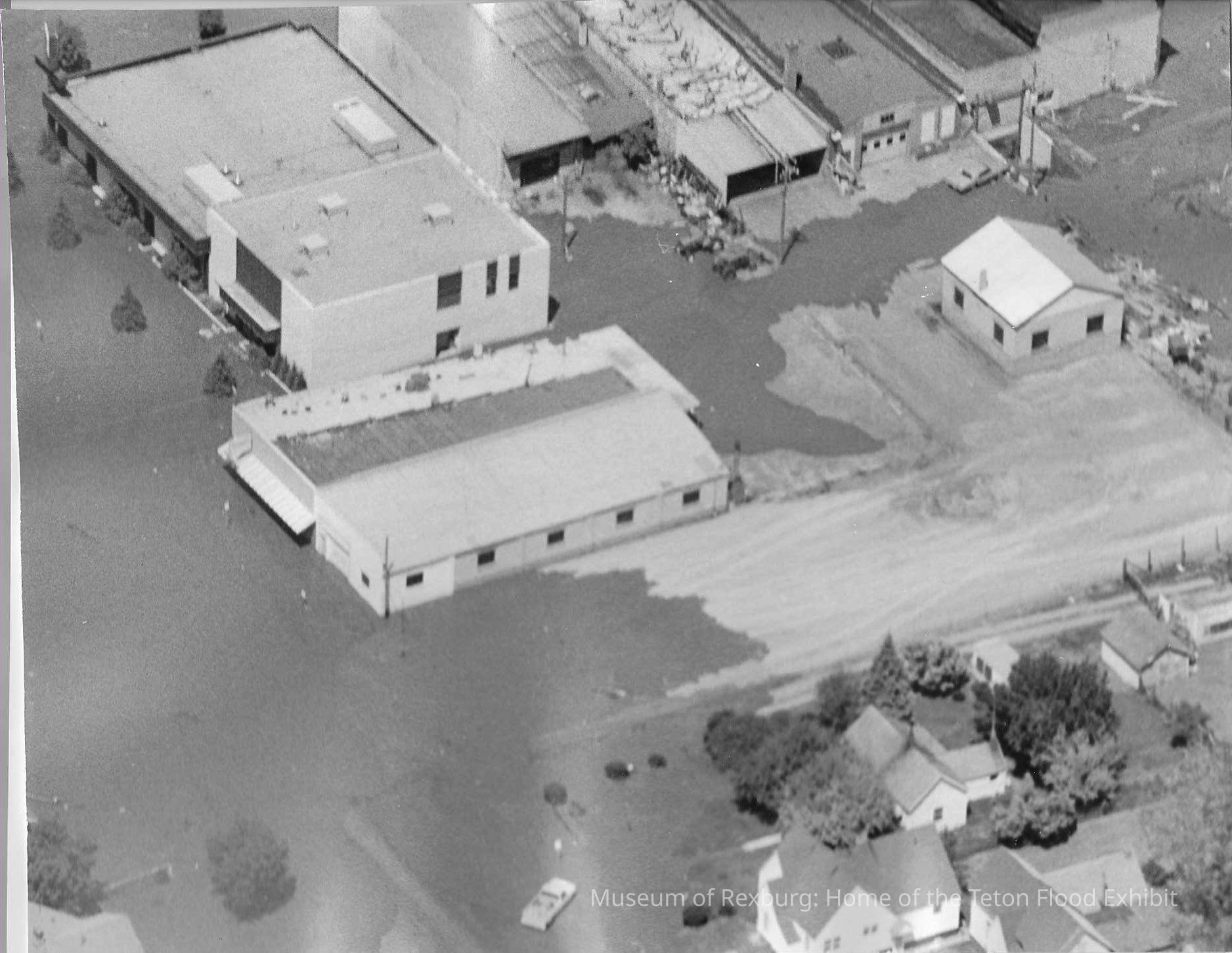 The photo is in black and white. The subject of the photo is a warehouse complex that has been hit by the flood. The bottom right corner contains some homes. but the majority of the photo is of the complex. Some of the buildings roofs are cracked and look like they are about to crumble. Others look like they withstood the force of the flood better. The dimensions of the photo are 7.25" X 9.25" This photo comes from the old Standard Journal Warehouse located at 23 S 1st E.