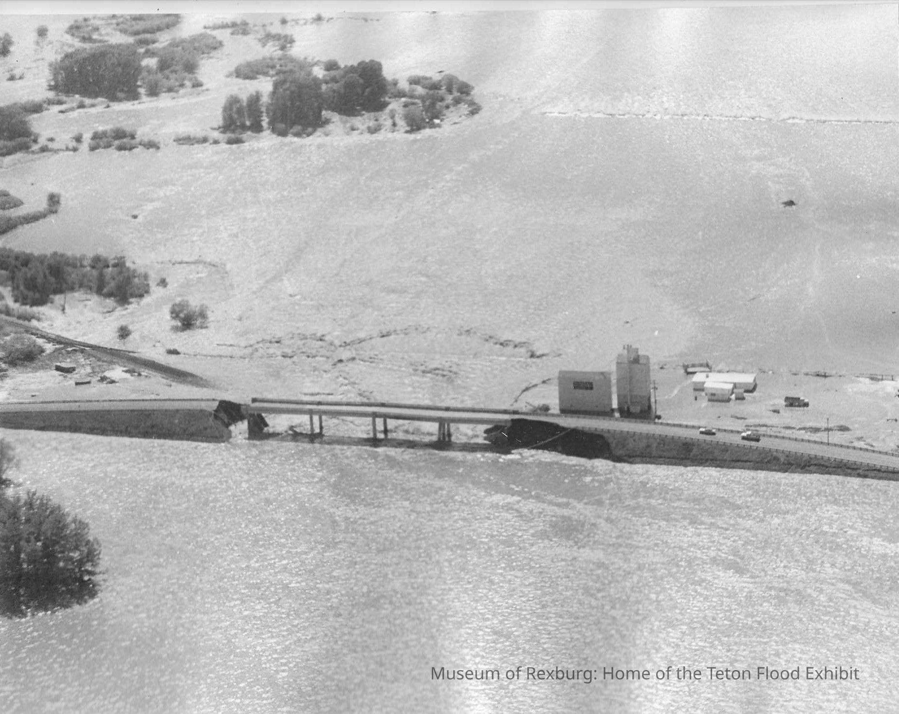 The photo is in black and white. The subject of the photo is a highway overpass that is sitting right above the flood waters. the portions of the highway before and after the overpass are submerged under water. There are also two cars on the highway, however they look as though they are stopped on the road. A portion of the highway also looks like it crumbled under the force of the flood. The dimensions of the photo are 7.25" X 9.25". This photo comes from the old Standard Journal Warehouse located at 23 S 1st E.