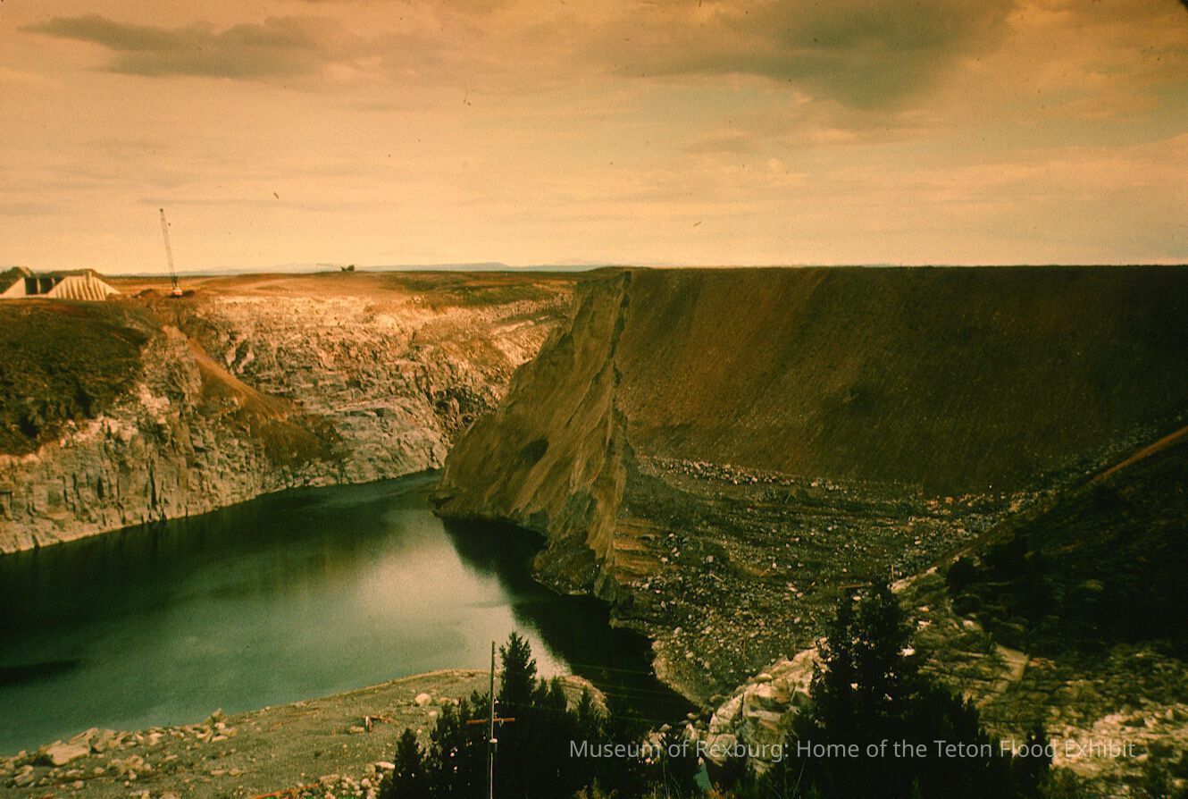 The photo was take in colour, but it is believed it was taken later in the day as the sun began to set, setting the sky ablaze in orange hues. The subject mater of the photo is ground zero of the Teton Flood. What is left of the reservoir is quiet an calm as if the flood had not crushed the Dam wall and barreled towards American Falls. The spillway is just barely in the shot on the left hand side of the photo. The foreground has a powerline and a small grouping of trees. The photo is a part of a digital collection donated to the museum by Rick Davis.