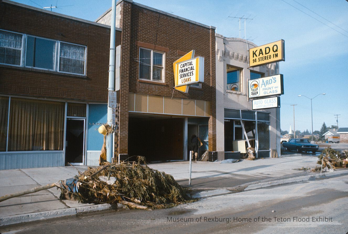 This photo was taken in colour and according to the donor was taken on the 7th of July. The subject of the photo is a few buildings on West Main St. The businesses in the photo are; KADQ Radio, Ard's Paint and Glass, and Capital Financial Services Loans. Each store front seemed to have been hit hard by the flood waters. The front windows and doors have been broken/taken out. Fallen trees litter the sidewalk. In the dorway for Capital Loans there is a person wearing all black cleaning out the storefront. Next to KADQ and Ard's is a black car. The photo is a part of a digital collection donated to the museum by Rick Davis.