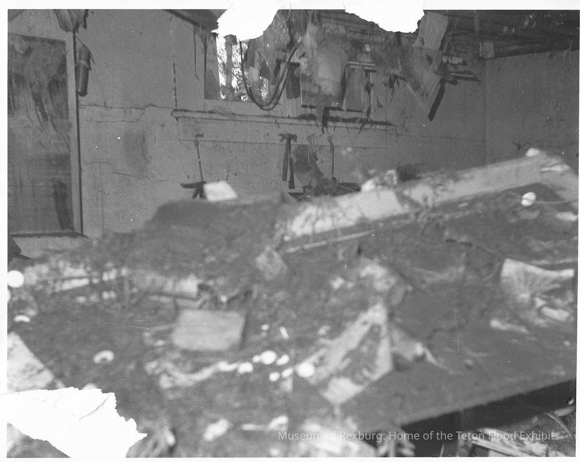This photo obtained damage while being removed from the laminate. This photo is a picture of the basement apartment of Terrell and Margaret Arnold home after the flood, June 1976. In the picture we can see lots of debris on the ground and hanging from the ceiling. This photo is connected to 1000-20-059, 1000-20-061, and 1000-20-062. This photo is 8 x 10 inches big. Found on bottom left of the poster it was removed from.