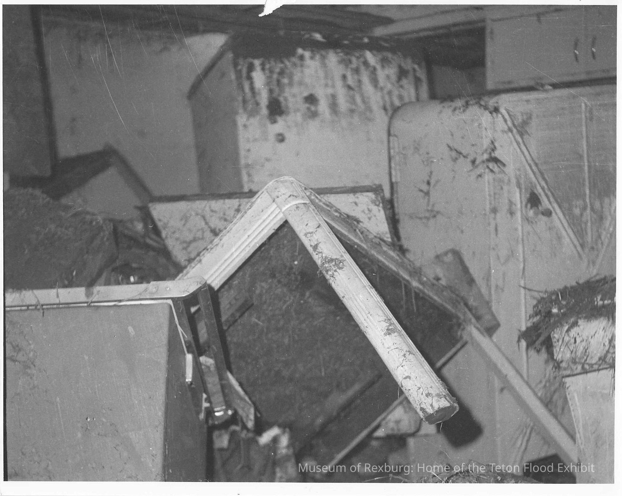 This photo is an 8x10 black and white photo with a chair, fridge, and other household items covered in grass and mud. The words Picture of basement apartment of Terrell and Margaret Arnold home after the flood, June 1976 was written below the photo. The photo is part of four that were laminated onto a pink poster board and was removed and was on the bottom right.
