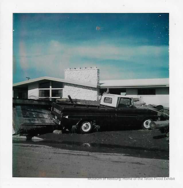 This photo is in color and is a polaroid. It shows Blair Berry's home that is right next to Merlin's show store. The pickup in the photo was placed there by the flood. This photo is 3.25 x 3.25 inches big.