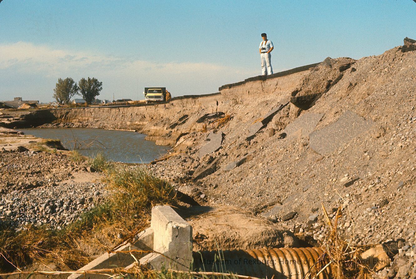 The photo was taken in colour. The subject of the photo is the Sugar City overpass at a section where the road collapsed. In the foreground of the shot is a sewage pipe, and the newly created cliffside where the road used to be. According to the notes, the man standing in the shot is named Bob Smith. He is wearing a light blue button-up shirt, and white pants. He has a camera hung around his neck, and is wearing sunglasses. The photo is a part of a digital collection donated to the museum by Rick Davis.