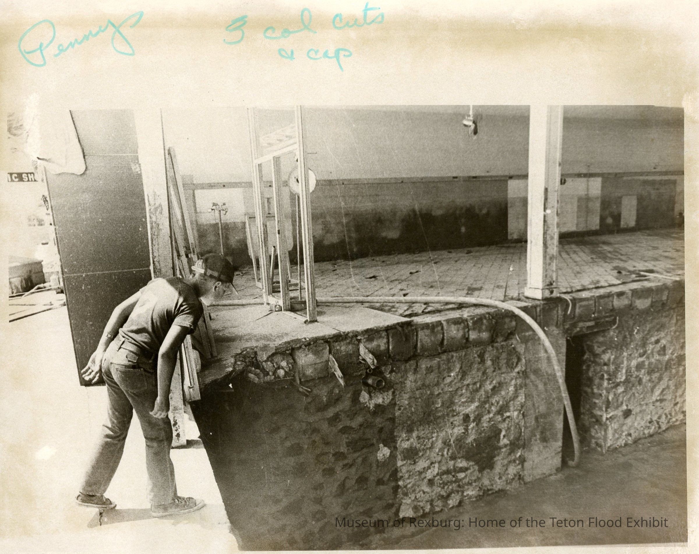 This photo was contained in a brown folder with many other photos. There was a note on the front in cursive that said, "Thanks Dave Gaut". This B&W photo shows a young man peering into a flooded basement. The floor has been washed away, and to the left of the exposed basement is some remaining floor and a pillar and a door frame. The young man is wearing jeans, a T-shirt and a baseball cap. A long hose is going from the floor to the basement to pump out the water. There's writing on the photo: "Pennys 3 col cuts & cap". This could be the basement of the JC Penney building. There's writing on the back as well: "Basement gets 80%". This photo is 7 7/8x10". This photo comes from the old Standard Journal Warehouse located at 23 S 1st E.