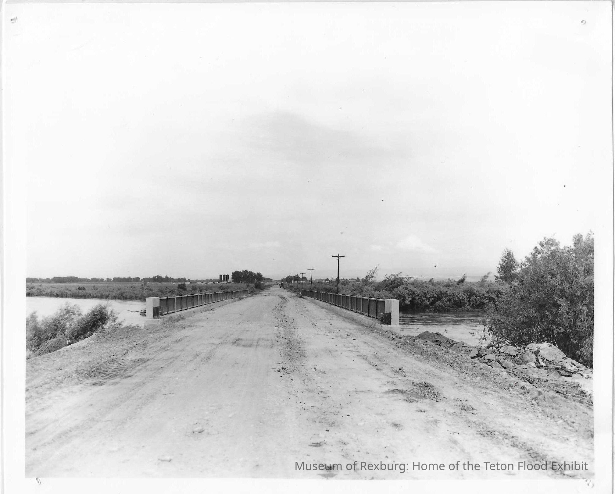 This photo is an 8x10 and is black and white and is also laminated. There is a bridge in the center of the photo which is panning a river with three silos on the left of the bridge. The words Highway 33 looking east towards Rexburg. This bridge moved a little and traffic had to be routed to the north into Plano are written beneath the photo on the green paper it was glued on. Locals claim that it is the bridge by Beaver Dick Park.