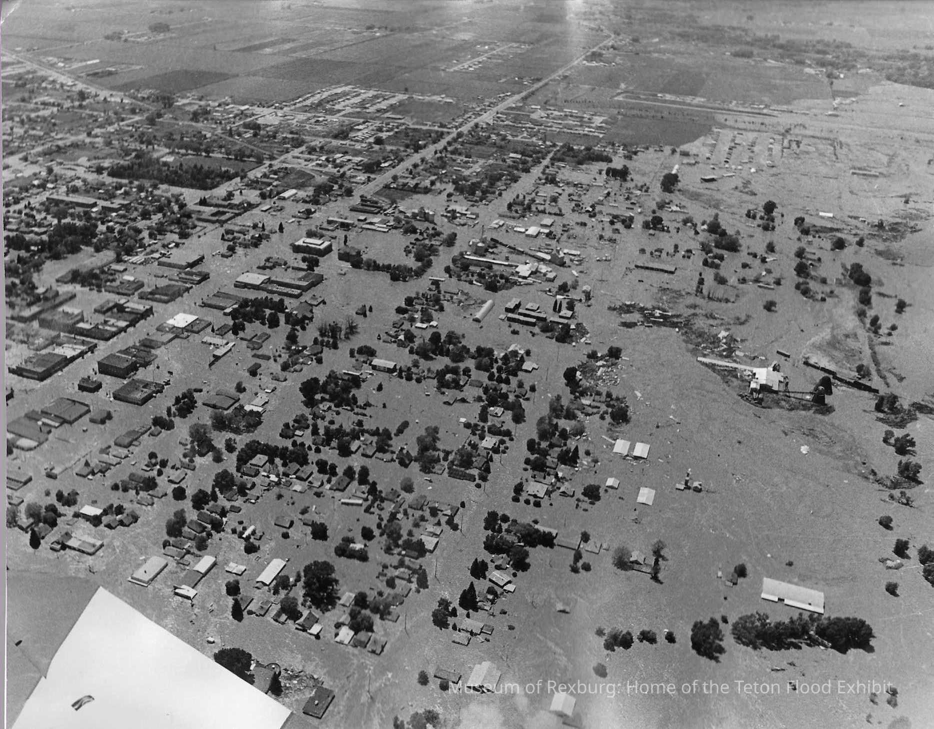 The photo is in black and white. The subject of the photo is a broad aerial view of Rexburg. It is hard to see but in the left center the Tabernacle can be seen. In the bottom left corner of the photo is a large white square. It is believed that the object might be a part of the plane ore helicopter from which the photo was taken. The photo is similar to 2021-20-130 however it is at a different angle. The dimensions of the photo are 7.25" X 9.25".This photo comes from the old Standard Journal Warehouse located at 23 S 1st E.