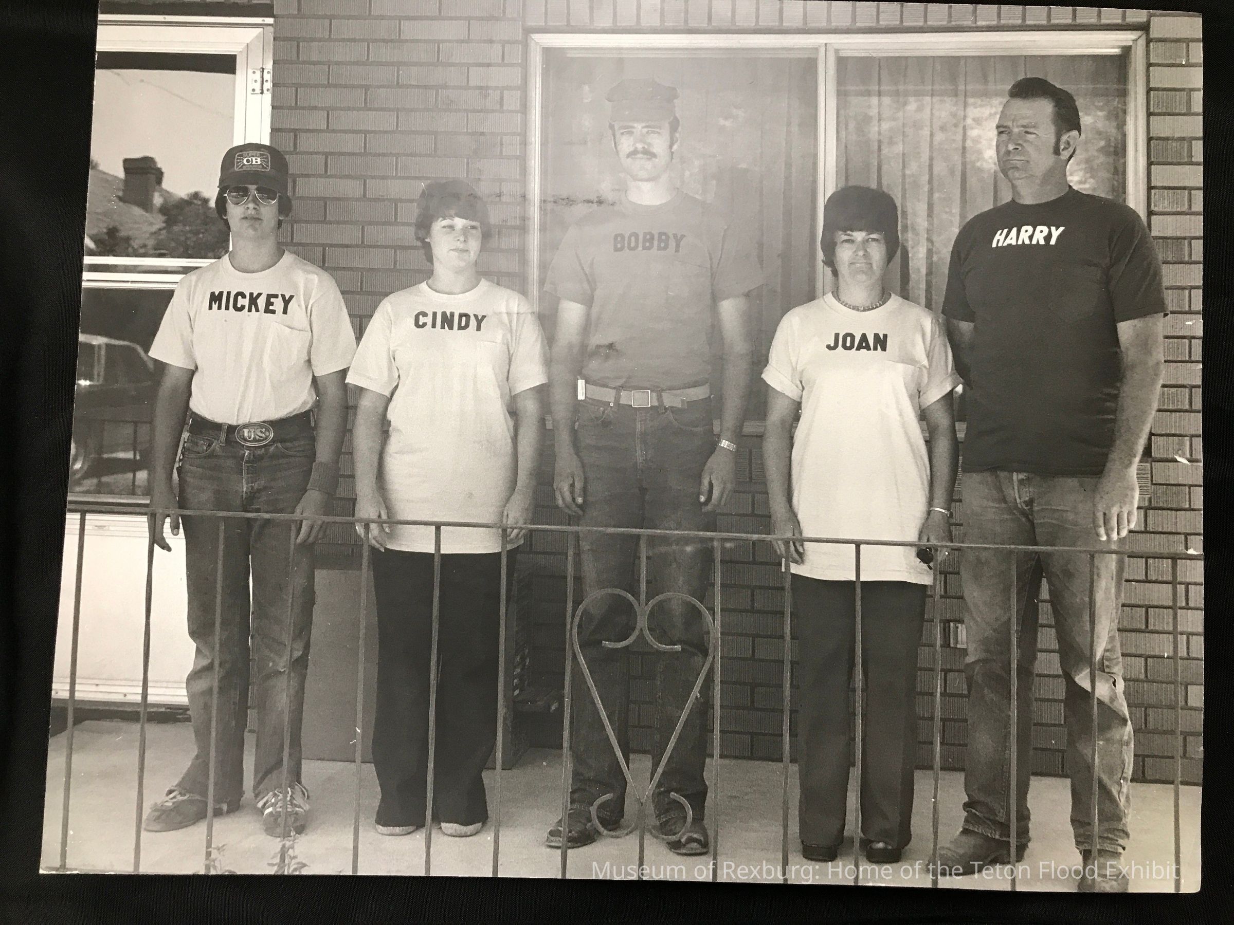 This photo is black and white and shows the Brunson Family standing on the front porch of their home. They are wearing their flood shirts. In the photo 1000-20-216, we can see the backside of their shirts and what they say. Their shirts have their names on them. This photo is 15.5 x 20.75 inches big. From left to right their shirts read, "Mickey, Cindy, Bobby, Joan, and Harry." On the back of this photo there is a small piece of paper taped to the back that was removed and placed in its folder that reads, " March 4 - We hope you can use these newspapers. If we get any more I'll let you know. The 2 pictures were taken by Quincy Jensen. We feel that they are more appropriate for the Rexburg Museum (or area) Hope this helps. LaDean Harmston Bonneville Museum." This note is written in cursive in black pen. There is a small note written in pencil in the lower right hand corner that reads, "DrFf9". It is written in pencil in cursive. This photo is associated with 1000-20-216 and 1000-20-217.