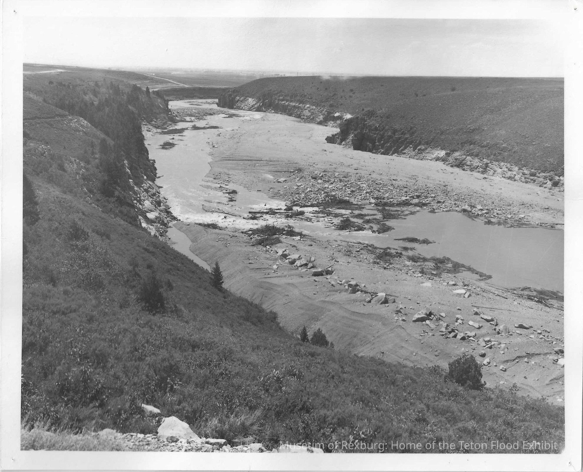 This photo is an 8x10 and is black and white and is also laminated. Shown is the canyon after the dam broke. It filled with silt, water, and large boulders. The words P549-100-228-A Teton Project, Idaho Looking downstream at the river channel from a point just below the Teton Dam. 6-6-76 Bureau of Reclamation photo by Glade Walker is written in the back in the center. The words Credit U.S. Department of the Interior Bureau of Reclamation Region 1 Box 043- 550 W Fort St Boise Idaho 83702 P-549-100-228 A is written in the bottom left corner. The words 4 Top 1 are written in the top left corner in pencil.