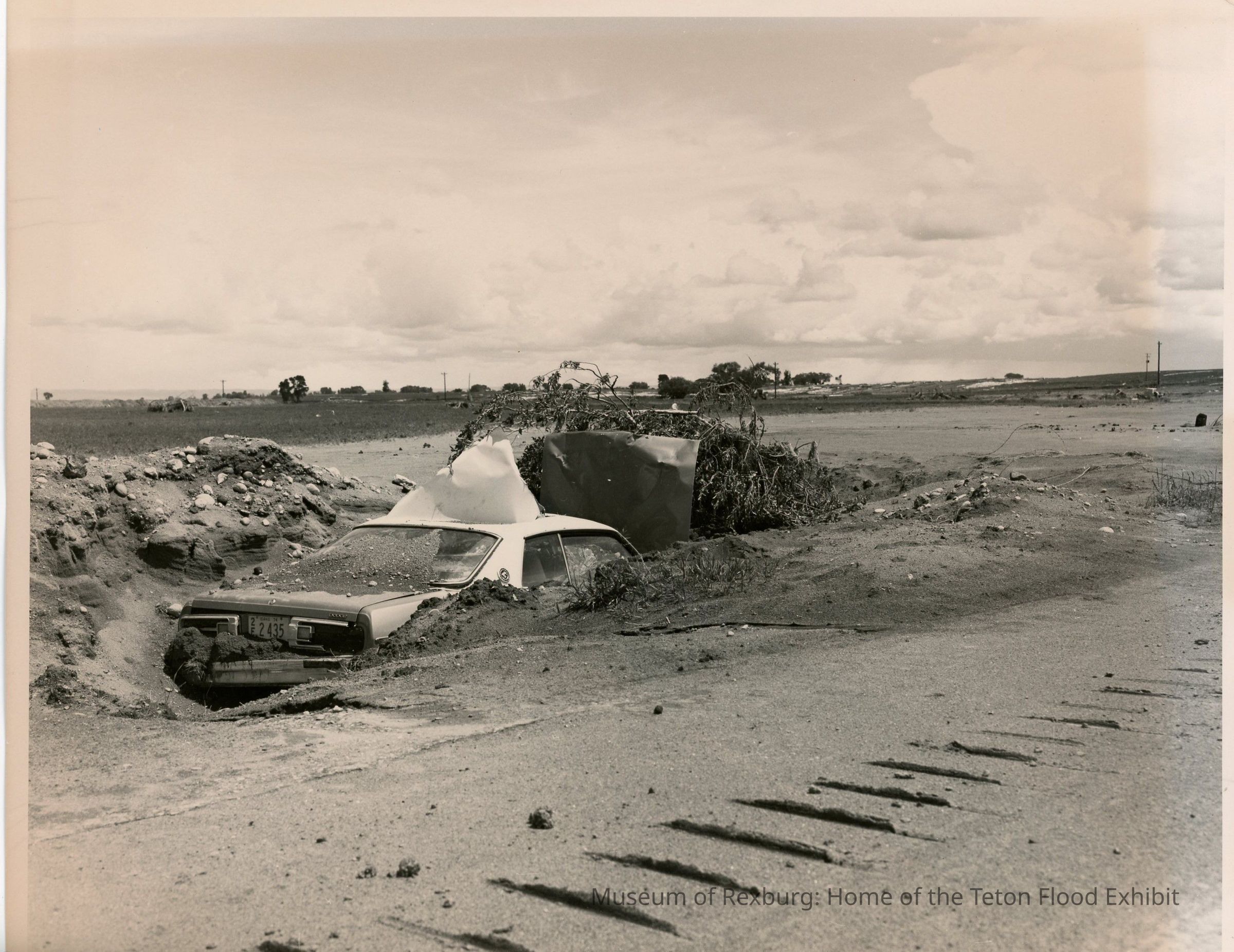 The photo was taken in black and white. The subject of the photo is a two-door sedan buried under mud. The hood of the car is shoved up, and the metal roofing is slightly ripped off. There are tracks right next to the the car. The dimensions of the photo are 7.25" X 9.25" This photo comes from the old Standard Journal Warehouse located at 23 S 1st E.