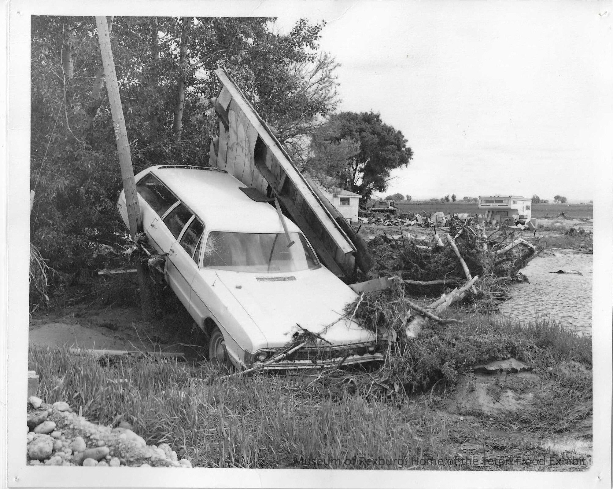 side and a house in the background of the photo. The words P549-100-283-A Teton Project, Idaho This car is parked in a tree admist debris as a result of flooding following the break of the Teton Dam. It is near Sugar City. 6-18-76 Bureau of Reclamation photo by Glade Walker is written in the back in the center. The words Credit U.S. Department of the Interior Bureau of Reclamation Region 1 Box 043- 550 W Fort St Boise Idaho 83702 P-549-100-283 A is written in the bottom left corner. The words 3 middle 4 are written in pencil on the back in the top left.