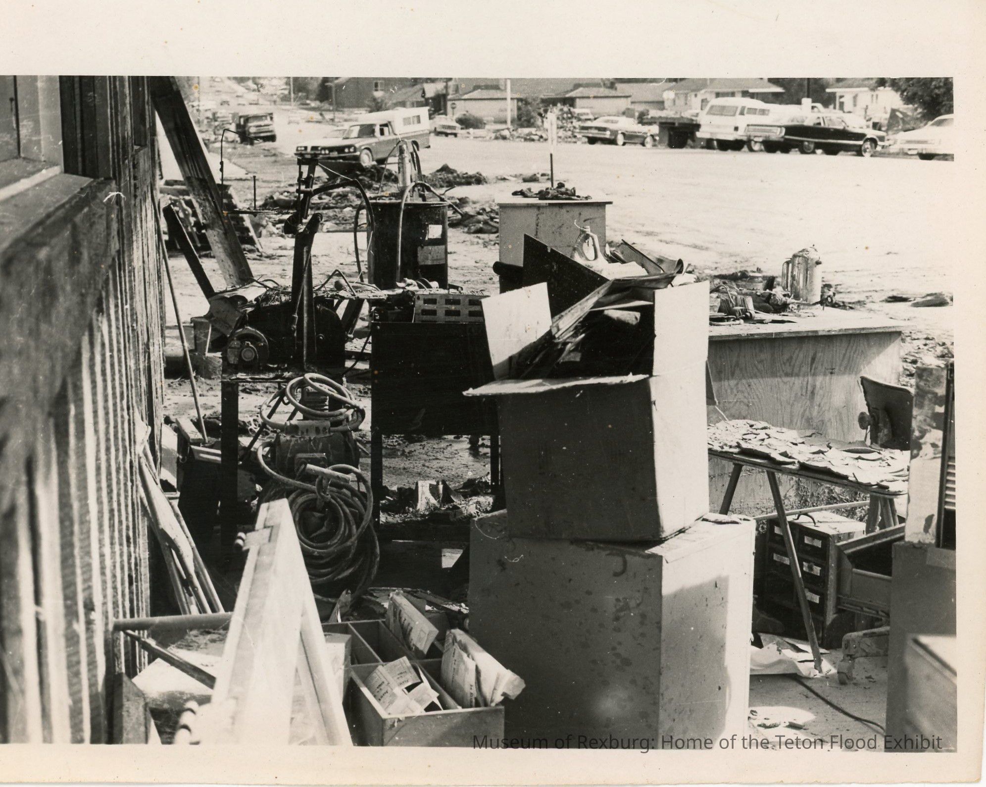 This photo is taken along the outer edge of a building. Boxes, hoses, tables, file boxes and other items are stacked outside and have water & mud damage. There are cars and trucks parked along the street in the background. Mud and debris is visible along the edges of the street. This photo is 6& 13/16thx5.5. This photo comes from the old Standard Journal Warehouse located at 23 S 1st E.