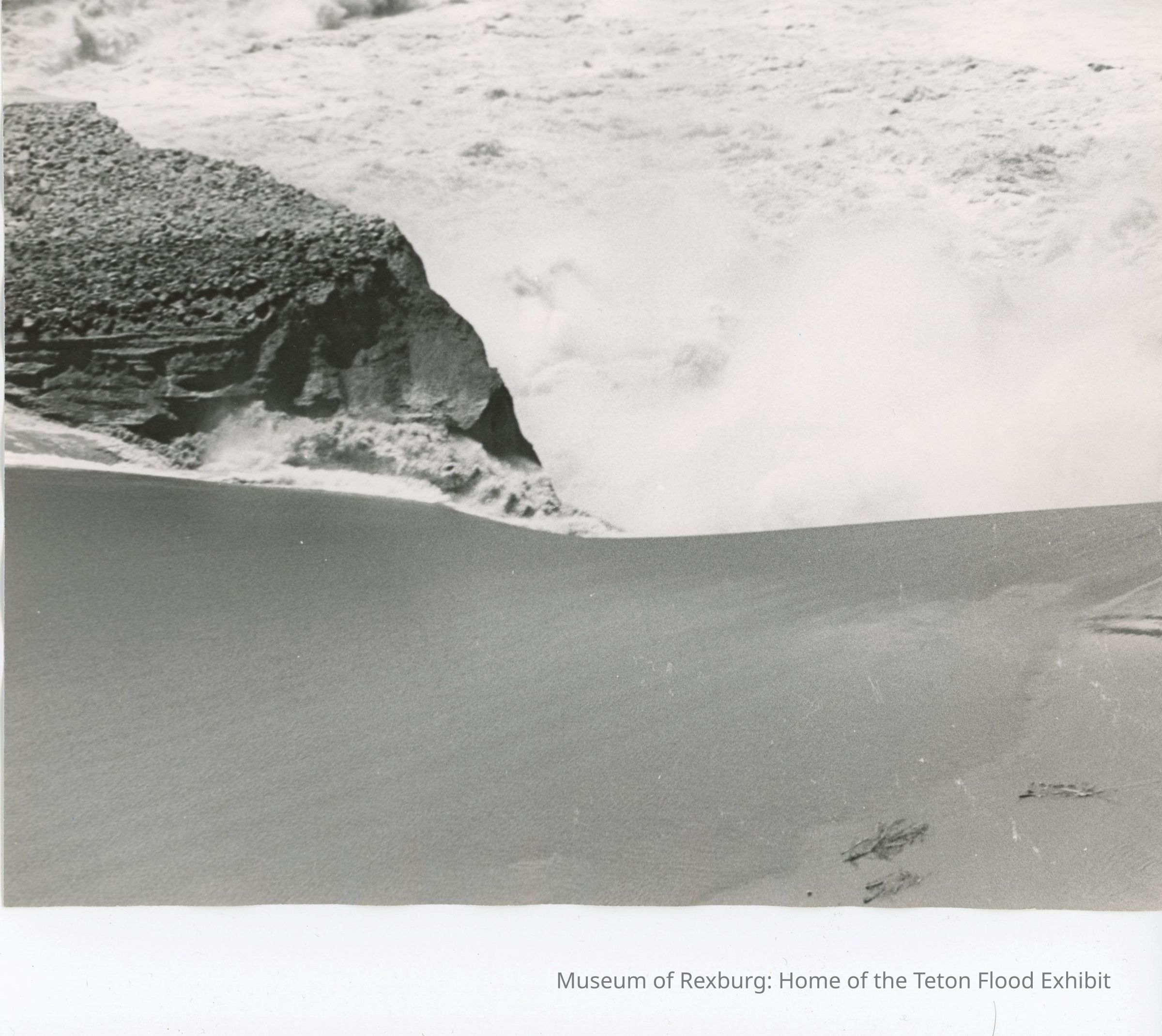 This photo shows a closeup of the dam breaking - the bottom half shows the water smooth with some debris floating in it, and the left volcanic bank is on the left. In the top half of the photo shows the agitated water pouring out. This photo is 9 & 9/16 x 7 & 3/8. This photo comes from the old Standard Journal Warehouse located at 23 S 1st E