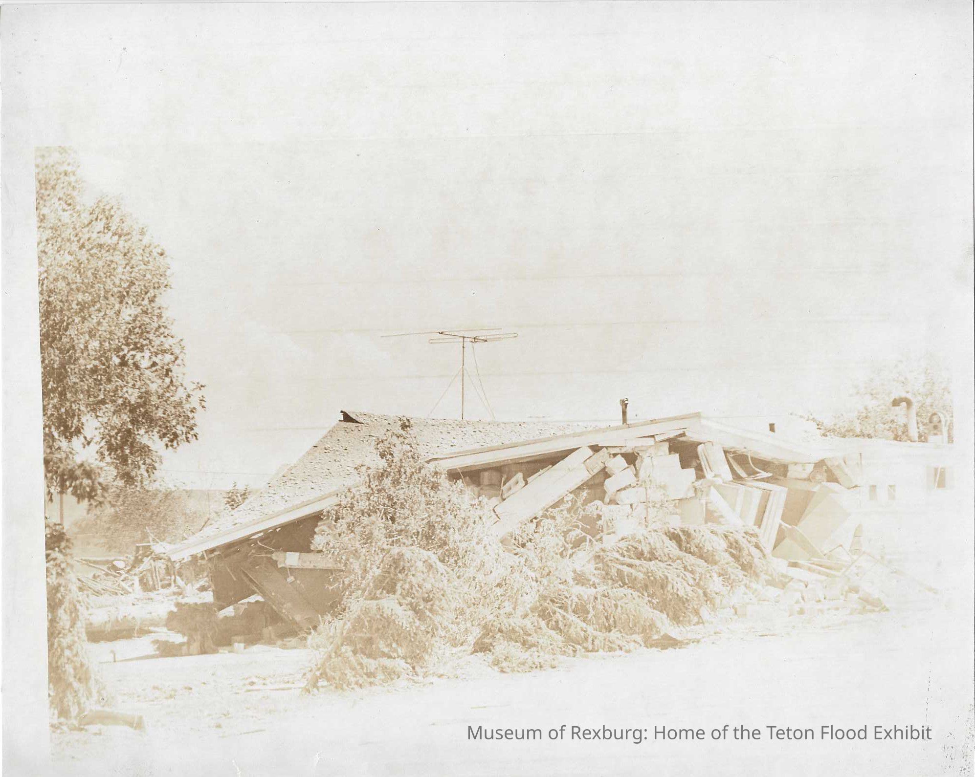 The photo was contained in a brown envelope with "Thanks Dave Gauts" written in cursive on it. The photo was taken in black and white, however was over exposed to create a sepia like colour to it. The subject of the photo is a home that has been completely demolished by the flood. There is debris and portions of the home in the front yard. The dimensions of the photo are 8" X 11". This photo comes from the old Standard Journal Warehouse located at 23 S 1st E.
