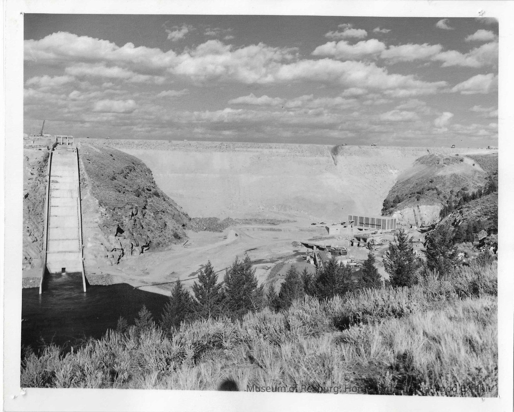 This photo is an 8x10 and is black and white and is also laminated. The Teton Dam is sitting in the center of the photo with the spillway on the left and the powerhouse is on the right. You can see tractors and trucks on the top of the dam . The words P549-100-196-I Teton Project, Idaho Teton Dam is located on the Teton River in northeast Idaho. It is an earth and rockfill structure which will create a 17-mile-long reservior. 11-6-75 Bureau of Reclamation photo by Glade Walker is written in the back in the center. The words Credit U.S. Department of the Interior Bureau of Reclamation Region 1 Box 043- 550 W Fort St Boise Idaho 83702 P-549-100-196 I is written in the bottom left corner. The words 1 bottom 4 are written in the top left corner in pencil.