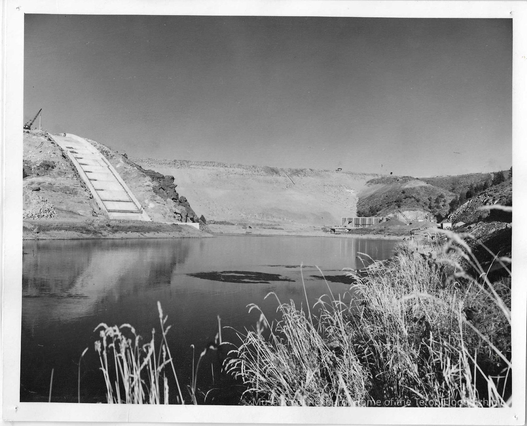 This photo is laminated. This photo is 8 x 10 inches big. This photo shows a view of the Teton Dam before it failed on June 6, 1976. This photo is in black and white. There is a small note that reads, "A view of the Teton Dam showing the face of the Dam and the spillway. November 5, 1975". On the back of the photo there is a small box on the lower left hand corner that reads, "Credit U.S. Department of the Interior Bureau of Reclamation Region I Box 043 - 550W. Fort St. Boise, Idaho 83702". There are also the numbers P-549-100-179 I. On the back it also reads, "Teton Project, Idaho A view of Teton Dam in eastern Idaho, showing the face of the Dam and the spillway. 11-5-75 Bureau of Reclamation photo by Glade Walker."