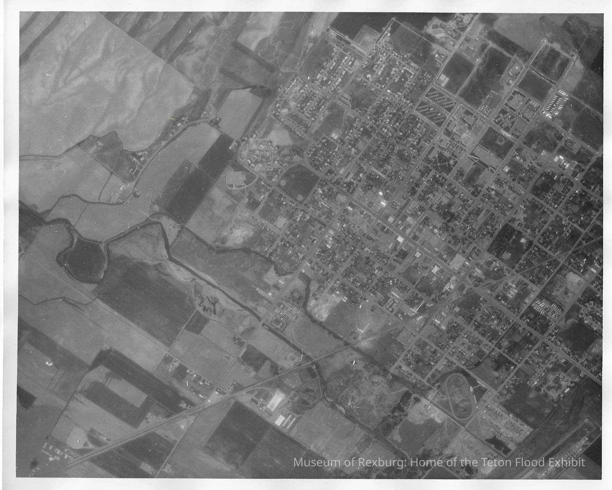 This photo is an 8x10 black and white aerial photo. On the back it says BONES STALL AC929 5 Jun76 1820T KA56 Rexburg and Ricks ID in red marker. The photo is from very high up and shows the Rexburg and Ricks area and on the left of the photo are more fields.