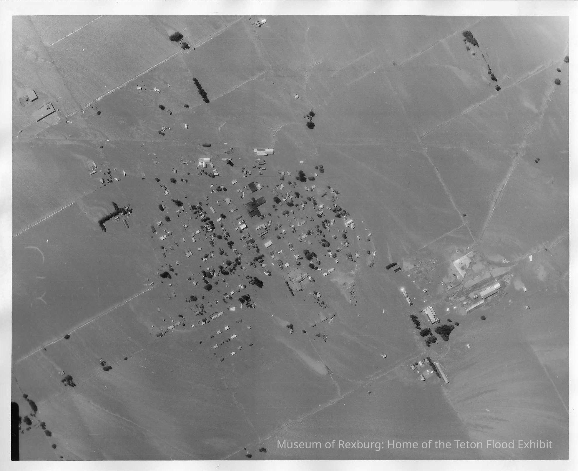 This photo is 8x10 black and white photo. The whole city is completely covered. On the back it says Town/Petro A/C 902 5 June 76 1645 T KS 87 Sugar City, Idaho, in black marker.You can see the majority of the town is in the center of the photo.