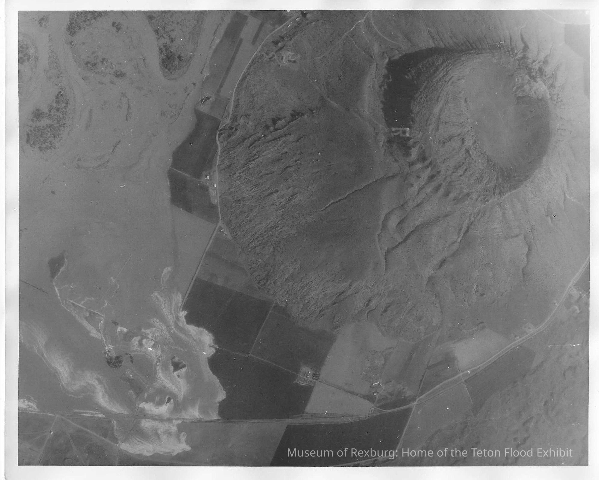This photo is 8x10 black and white photo. On the back it says HUD/THORN A/C 922 5 June 76 1616T KA 56 Menan Butte Idaho on black marker. In the top right corner is the Menan Butte and you can see the R on the mountain and the flood water is coming from the left of the photo.