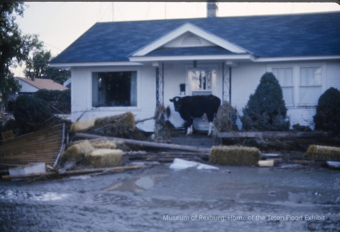 This photo was taken in colour during the evening. The location according to the Donor is 2nd E and Smith Park. The home in the photo is a white paneled home that is single storied. The chimney is a grey brick and is in the middle of the home. The front lawn is covered in mud, hay and other debris. On the front porch of the house is a black and white cow looking towards the camera. The photo is a part of a digital collection donated to the museum by Rick Davis.