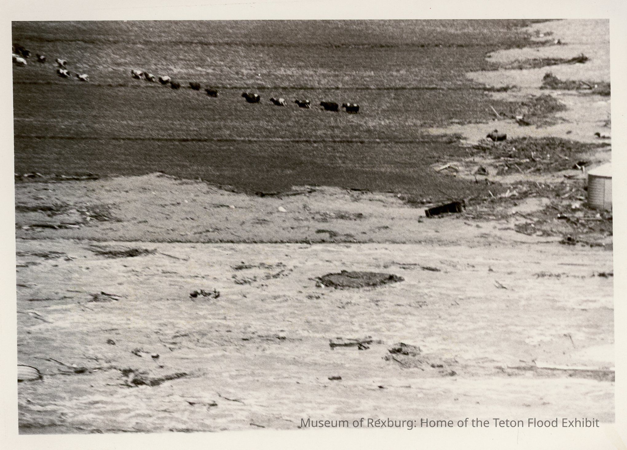 The photo was taken in black and white. The subject of the photo is a herd of bovine running away from the encroaching flood waters. The Herd of cows are running in a straight line. The dimensions of the photo are 5" X 7". This photo was contained in an envelope with "Thanks Dave Gauts" written in cursive. This photo comes from the old Standard Journal Warehouse located at 23 S 1st E.