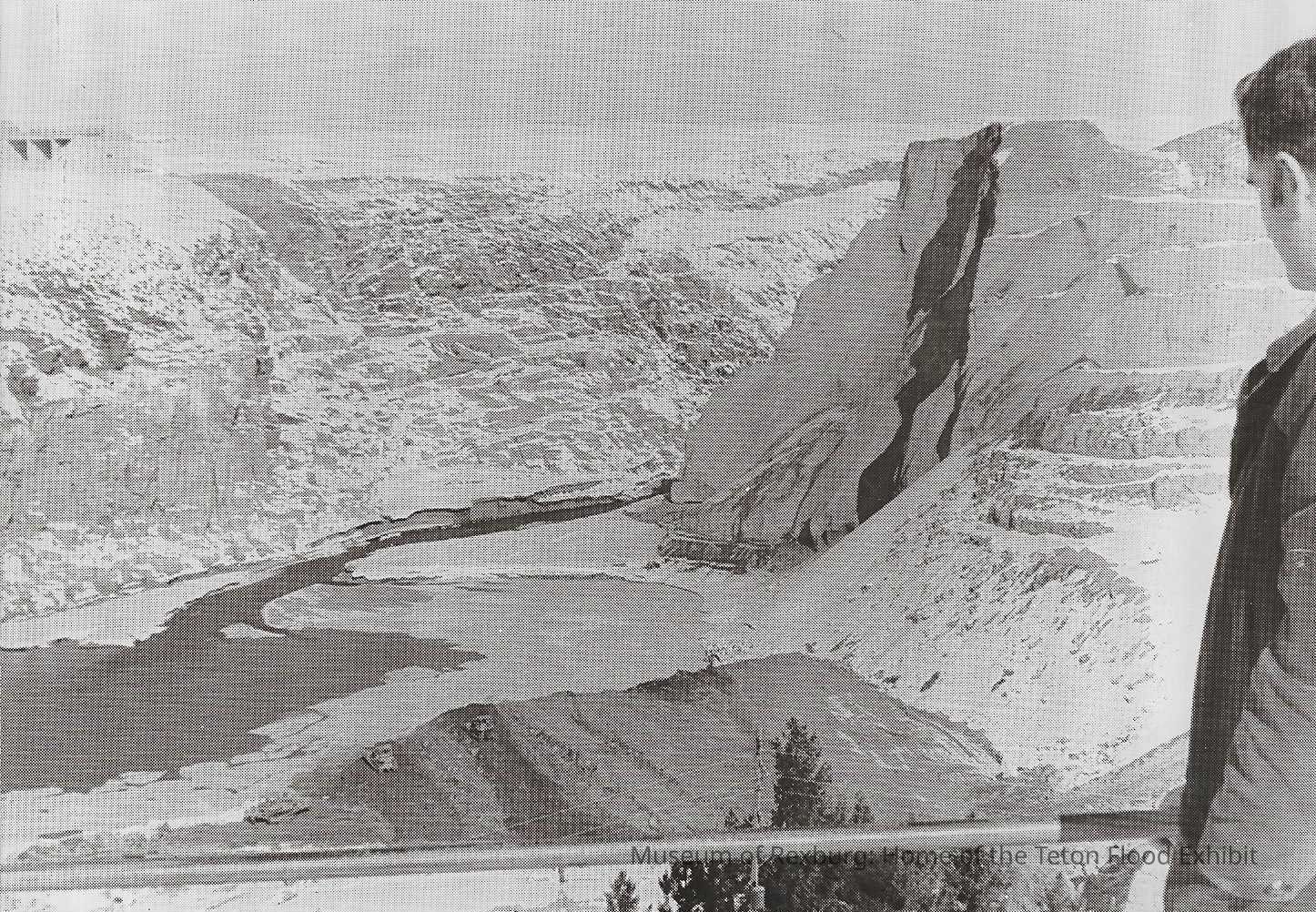 This photo is black and white and shows the Teton Dam Site after the reservoir was completely empty. We can see how the dam was completely eroded away. There is a man standing to the right of the photo partially out of frame. This photo is 5 x 7.25 inches big. This photo comes from the old Standard Journal Warehouse located at 23 S 1st E.