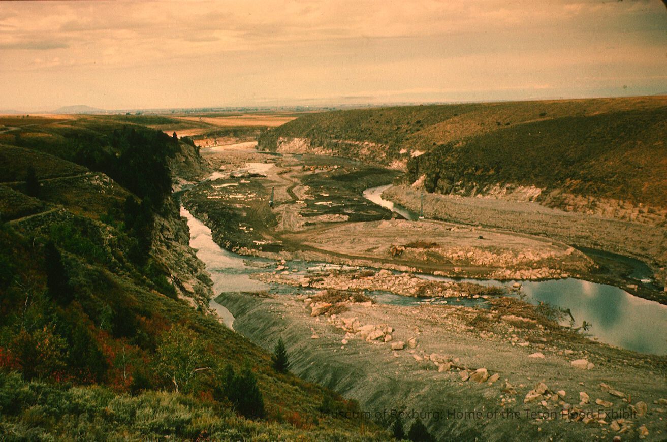 This photo was taken in colour. The subject of the photo is the dam site. The photo appears to have been taken later in the day when the sun began to set. The foreground of the photo contains shrubbery, portions of the Teton River, and outcroppings. The river looks as though it is mostly drained. The photo is a part of a digital collection donated to the museum by Rick Davis.