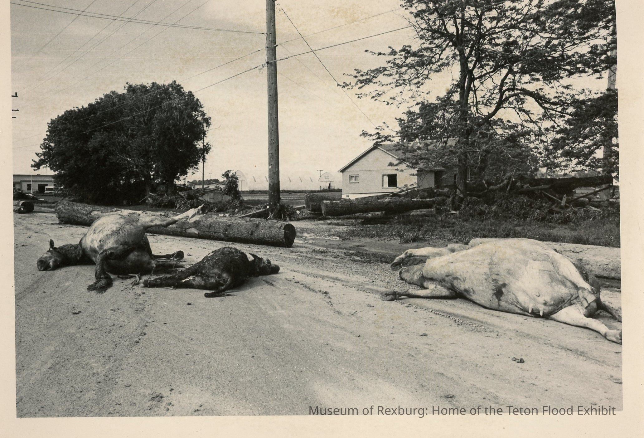 This B&W photo shows three dead animals in the road. The animal on the far left looks like a horse. The animal next to it looks like a calf. At a small distance from the 1st two animals, and a little closer to the camera is a light-colored cow, a female, as her udders are visible. All three animals are very stiff and look slightly bloated. Behind them in the road is a large log. At the middle of the phot is a telephone pole (undamaged). There are more logs to the right in the yard of a house which can be seen to the right. Farm buildings and other structures are in the background behind a small line of trees. On the reverse side of the photo are notes from the workers at the Standard Journal: "Standard. Not a pretty sight. 190% (crossed out) 225% (also crossed out), 190 (crossed out again) 90% (Circled) 100% (upside down & crossed out), 14,000, B-2 & 4 (upside down & crossed out). I've scanned the back of the photo as well. This photo is 5x7". This photo comes from the old Standard Journal Warehouse located at 23 S 1st E.