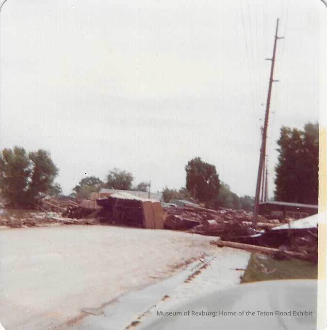 This photo is in color. This photo shows lots of debris that has been washed away down the road. There is an electric power pole on the right side of the photo. This photo is 3.5 x 3.5 inches big.