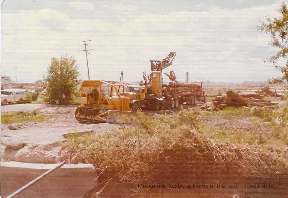 The photo is in colour, and is believed to have been taken midday. The sky is overcast. The subject of the photo includes large construction vehicles cleaning up fallen trees and logs from a wide open field. The construction vehicles are all yellow. The field where they are cleaning up has some foliage. The dimensions of the photo are 3.25" X 5" This photo comes from the old Standard Journal Warehouse located at 23 S 1st E.