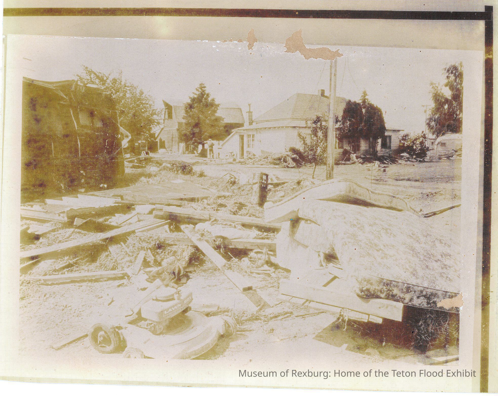 The photo was taken in black and white. The photo was over over exposed while it was being processed giving it a sepia look to it. The Subject of the photo is still visible. The subject is an intersection crowded with debris. Wood, mattresses and other items lay all over the street. The dimensions of the photo are 5.75" X 7.75" This photo was contained in a brown envelope with "Thanks Dave Gauts" written in cursive. This photo comes from the old Standard Journal Warehouse located at 23 S 1st E.