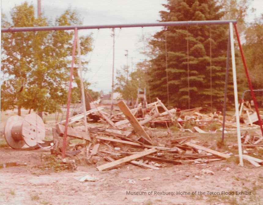 This photo is in color and shows a lot of debris carried by the flood waters that got deposited in a swing set in a playground. This photo is 3.5 x 4.25 inches big. This photo comes from the old Standard Journal Warehouse located at 23 S 1st E.
