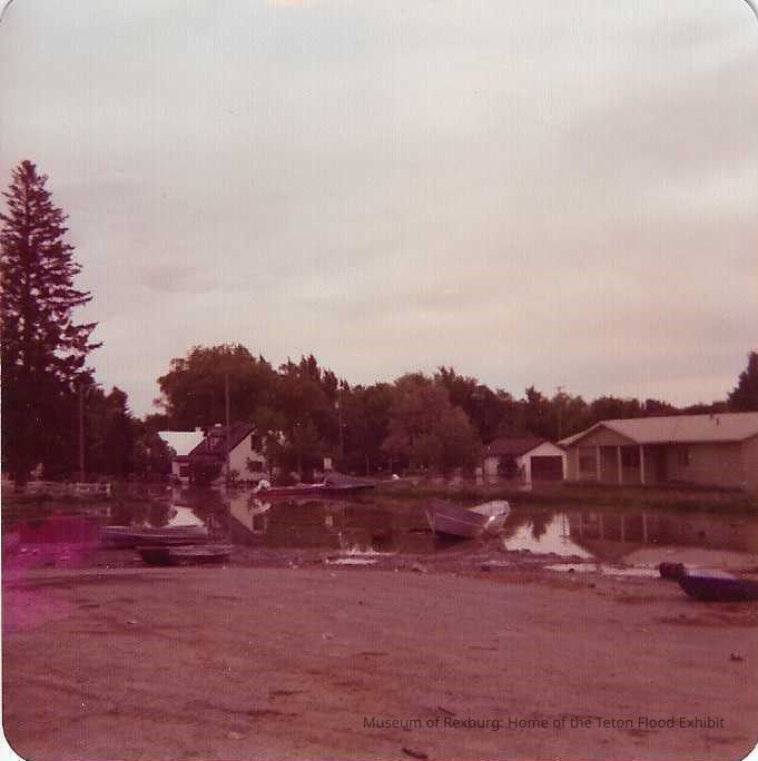 This photo is in color and shows flood water and flood damage in a neighborhood. There are lots of trees in the background and the majority of the homes are located on the right side of the photo. The foreground is full of mud, water, and debris. This photo is 3.5 x 3.5 inches big.