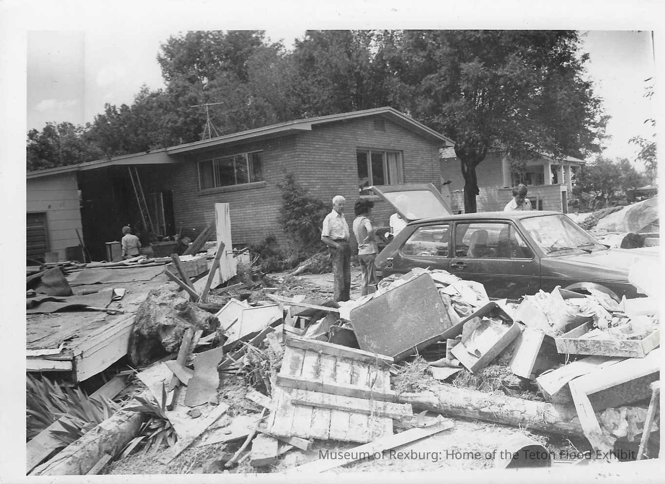 This photo is in black and white and shows five people working on cleaning away the flood debris that was deposited by the Teton Dam Flood waters in front of their home. There is a care parked out front. This photo is 5 x 7 inches big. On the back of the photo is written "Log recovering operation North West of Town" This photo comes from the old Standard Journal Warehouse located at 23 S 1st E.