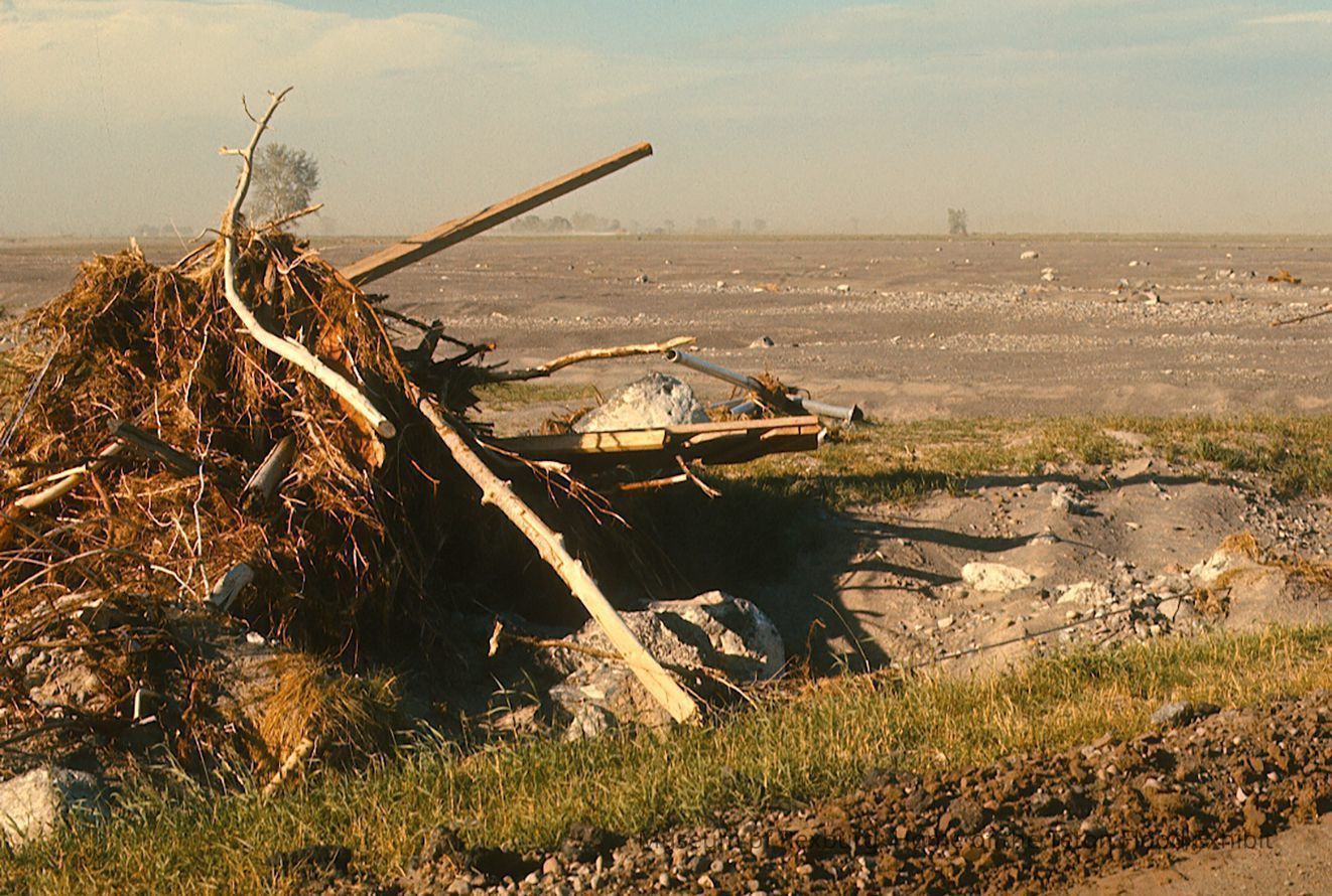 The photo was taken in colour. It is believed that the photo was taken later in the day since the saturation of the sunlight seems to be greater than during the noon hours. The subject of the photo is a pile of foliage debris in the left hand portion of the photo. The background is dominated by a field in which the top soil was taken by the waters. The photo is a part of a digital collection donated to the museum by Rick Davis.