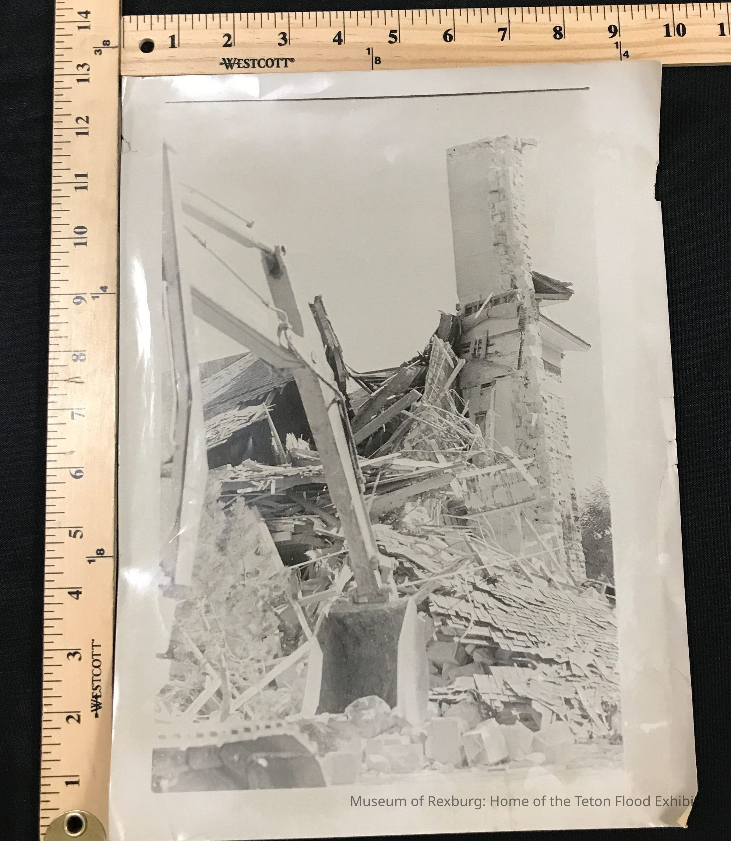 The photo is in black and white. The Subject of the photo is a home that was destroyed by the flood. The angle the photo was taken the entirety of the home was collapsed. The dimensions of the photo are 13" X 7". Although donated to the museum by TOTS Hauling & Delivery LLC, this photo belonged to the Standard Journal and was found in their old warehouse located at 23rd S 1st E.