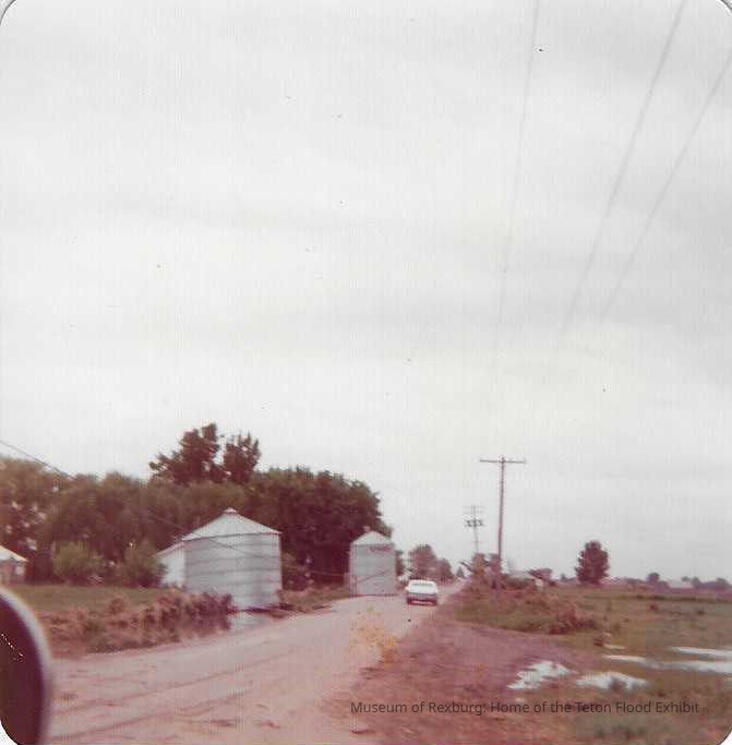 This photo is in color. It shows a dirt road with a car traveling away from the camera to the left of the photo are a few hidden homes in some trees and two grain silos that are sitting on the side of the road. There are puddles and mud on the right of the photo. This photo is 3.5 x 3.5 inches big.