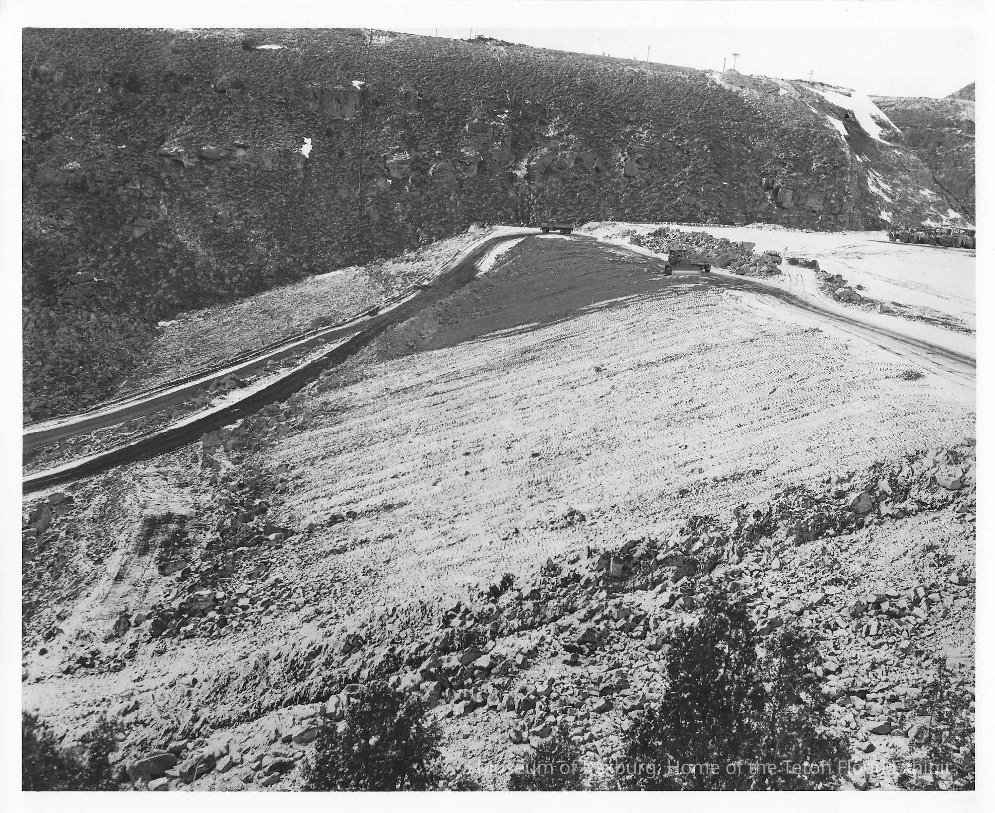 A) Back of photo has a label that reads: P549-147-5478 NA Teton Dam, Teton Project, Idaho. Downstream dam embankment showing final preparation downstream face of zone 5 material. Trench in lower part of photo is for duct bank. Morrison-Knudsen Company, Inc. and Peter Kiewit Sons' Company, 4/4/75 Bureau of Reclamation photo by B. Bockstruck.