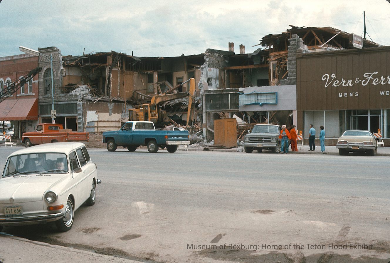 This photo was taken in colour. The subject of the photo is Johnson Drug, Bowen Music, and The Shoue Haus being torn down on East Main Street. In the photo the Village Shop and Vern & Ferrl are still standing. Main street is dusted over in mud, and there are a few cars parked along the curbs. The foreground contains a white hatchback with a child sitting in the front seat. The background contains various pick up trucks and a golden sedan. The photo is a part of a digital collection donated to the museum by Rick Davis.