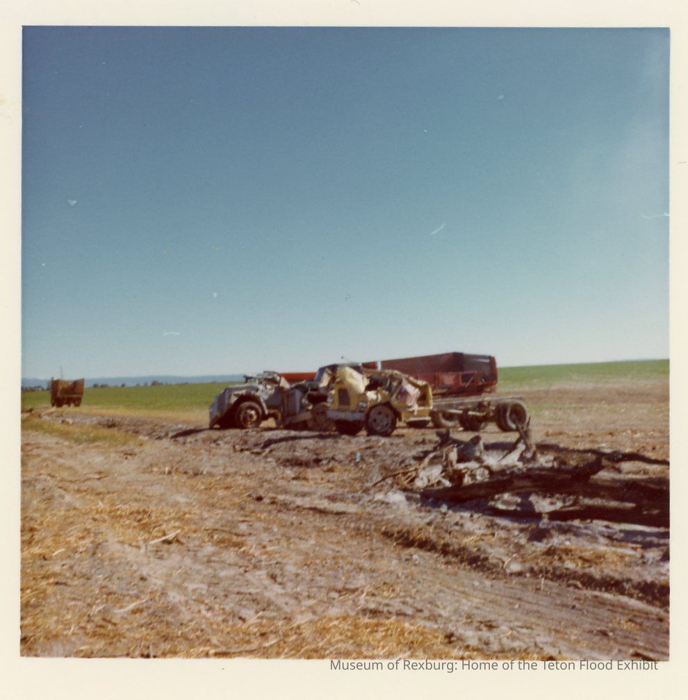 The photo is 3.5 X 3.5 and is in colour. The Subject of the photo is a plot of farm land with some debris, and the top soil stripped from it. The center of the shot has farm equipment that have been heavily damaged by the flood. The roofs of the trucks have been crushed in and are slightly caked in mud.