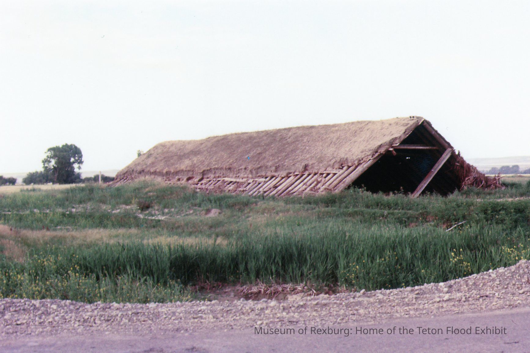 This photo was taken in colour. The subject of the photo is a farm structure with a thatched roof. It is a long triangle structure with no walls except for the two that make the roof outline. This structure is relatively undamaged, only a small portion of the roof collapsed. The structure is also sitting in a field of grass. The dimensions of the photo are 6" X 4".