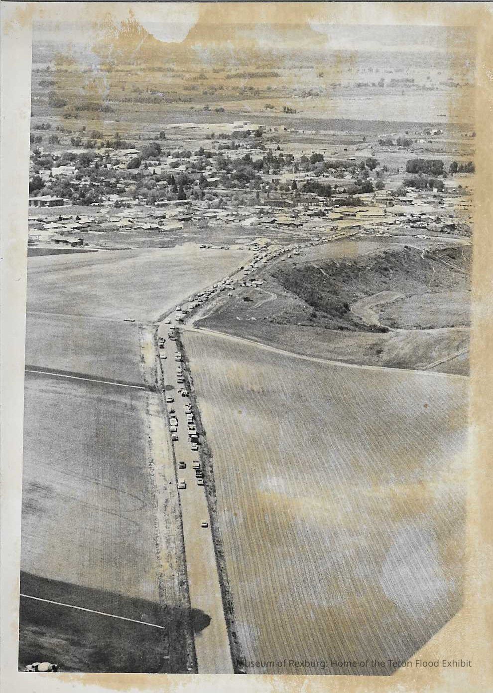 The photo is in black and white. It is an aerial view of the farmlands and the highway or interstate. There are homes in the upper portion of the photo. The dimensions of the photo are 7" X 5". This photo comes from the old Standard Journal Warehouse located at 23 S 1st E.