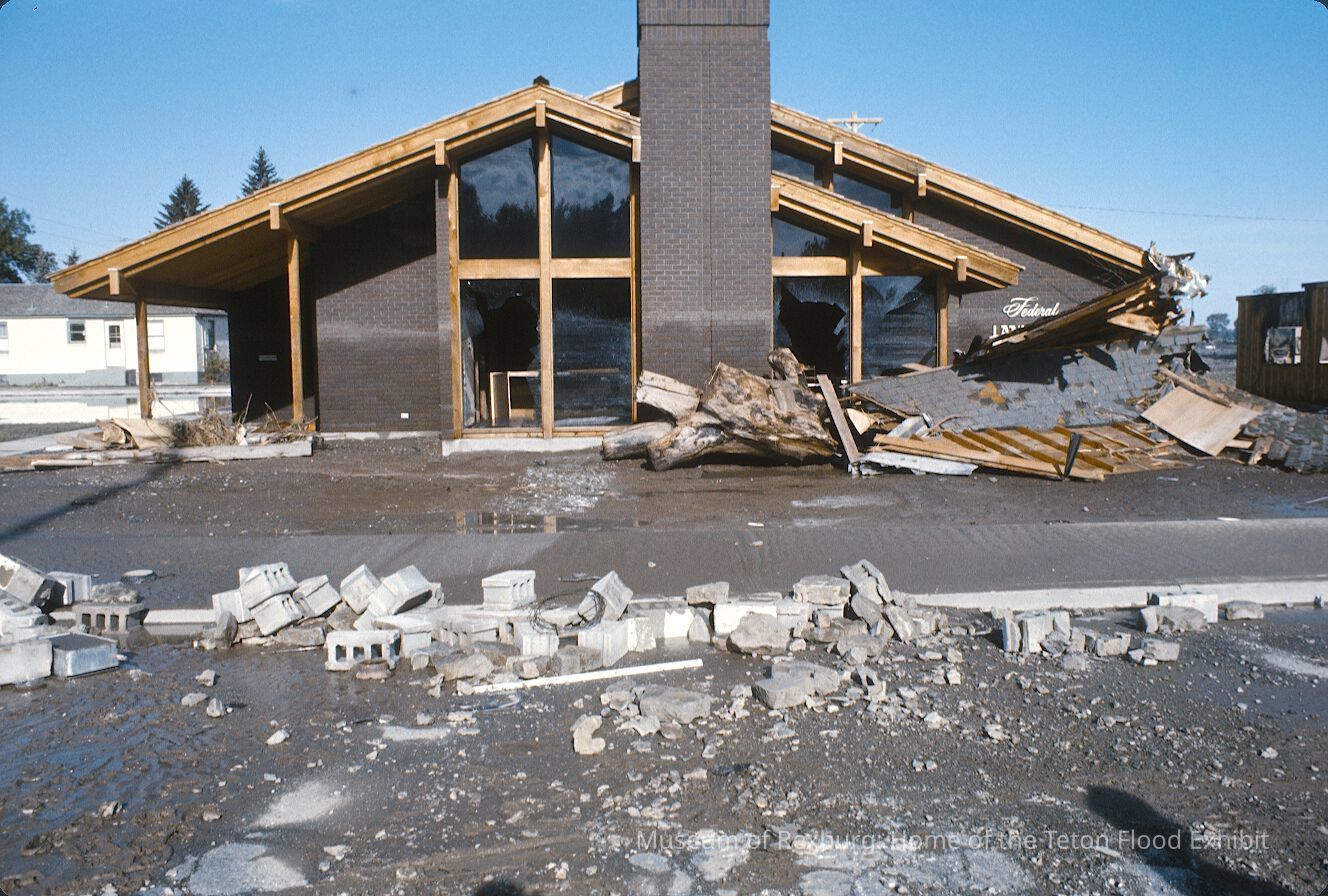 The photo was taken in colour. The subject of the photo is the grey brick building of the Federal Land Bank. The foreground of the photo is cinder blocks and a torn up road. A portion of the bank's roof has collapsed. The photo was taken during a clear day. The photo is a part of a digital collection donated to the museum by Rick Davis.
