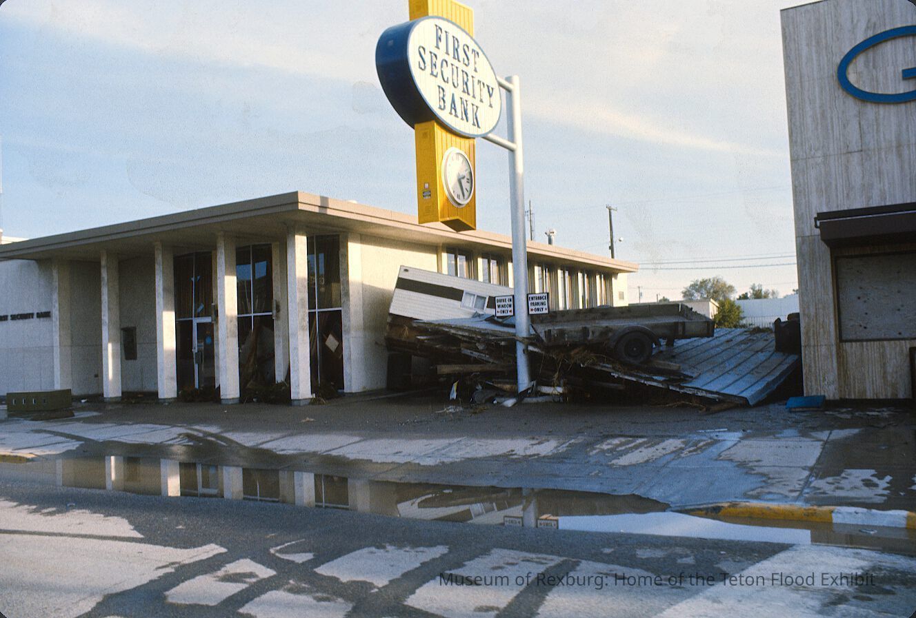 This photo was taken in colour. The subject of the photo shows First Security Bank, or the area where the current police department is. The photo was taken sometime soon after the waters receded. The location of this photo is on northern main street. The area between the bank and the other storefront. The debris consists of roofing, trailer and what appears to be a camper trailer. The photo is a part of a digital collection donated to the museum by Rick Davis.