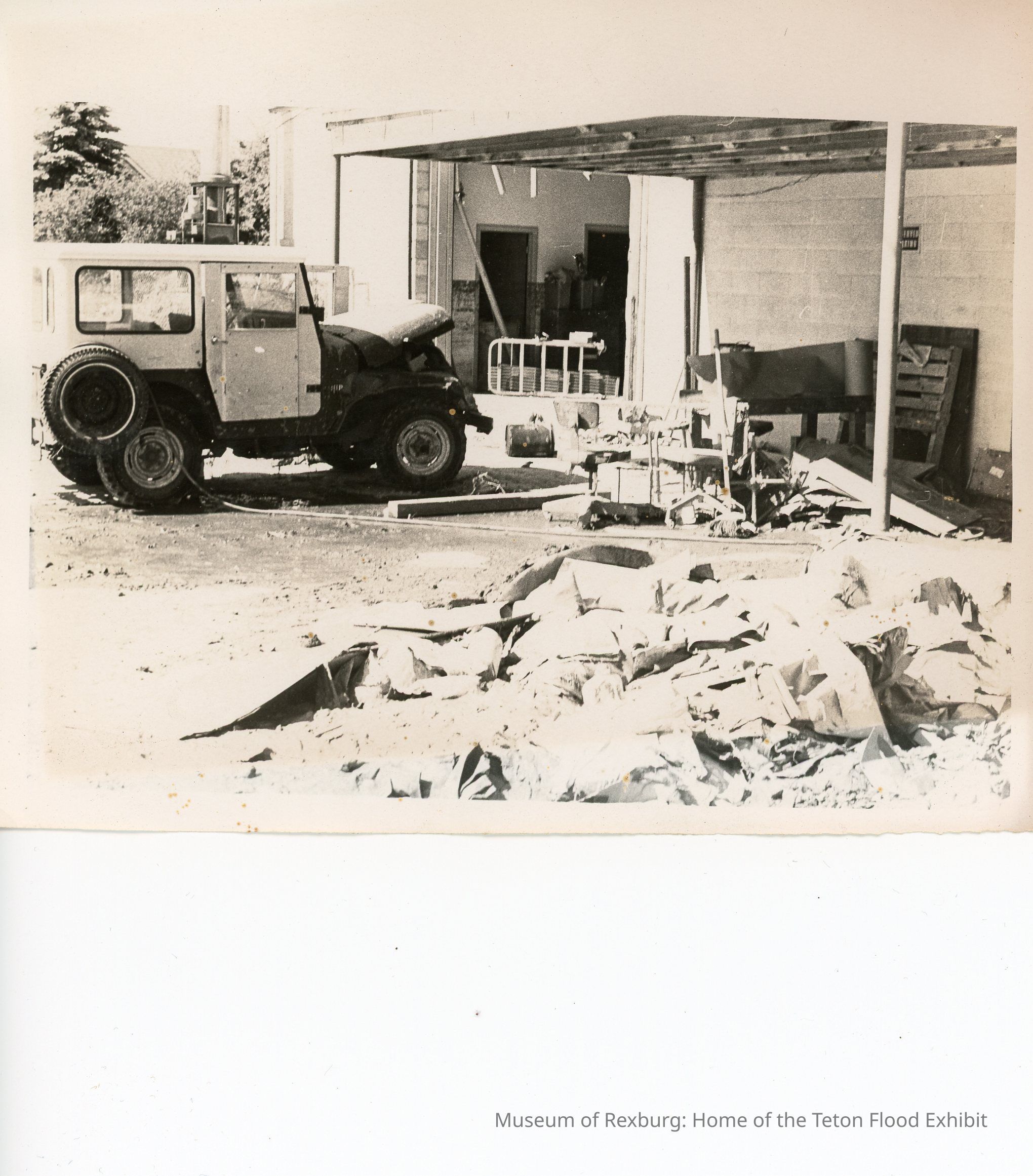 This photo shows a flood damaged building - a garage or back of a store possibly, with debris outside. To the left is a Jeep and in the foreground is a lot of flood rubble. This photo is 7x5.5". This photo comes from the old Standard Journal Warehouse located at 23 S 1st E.
